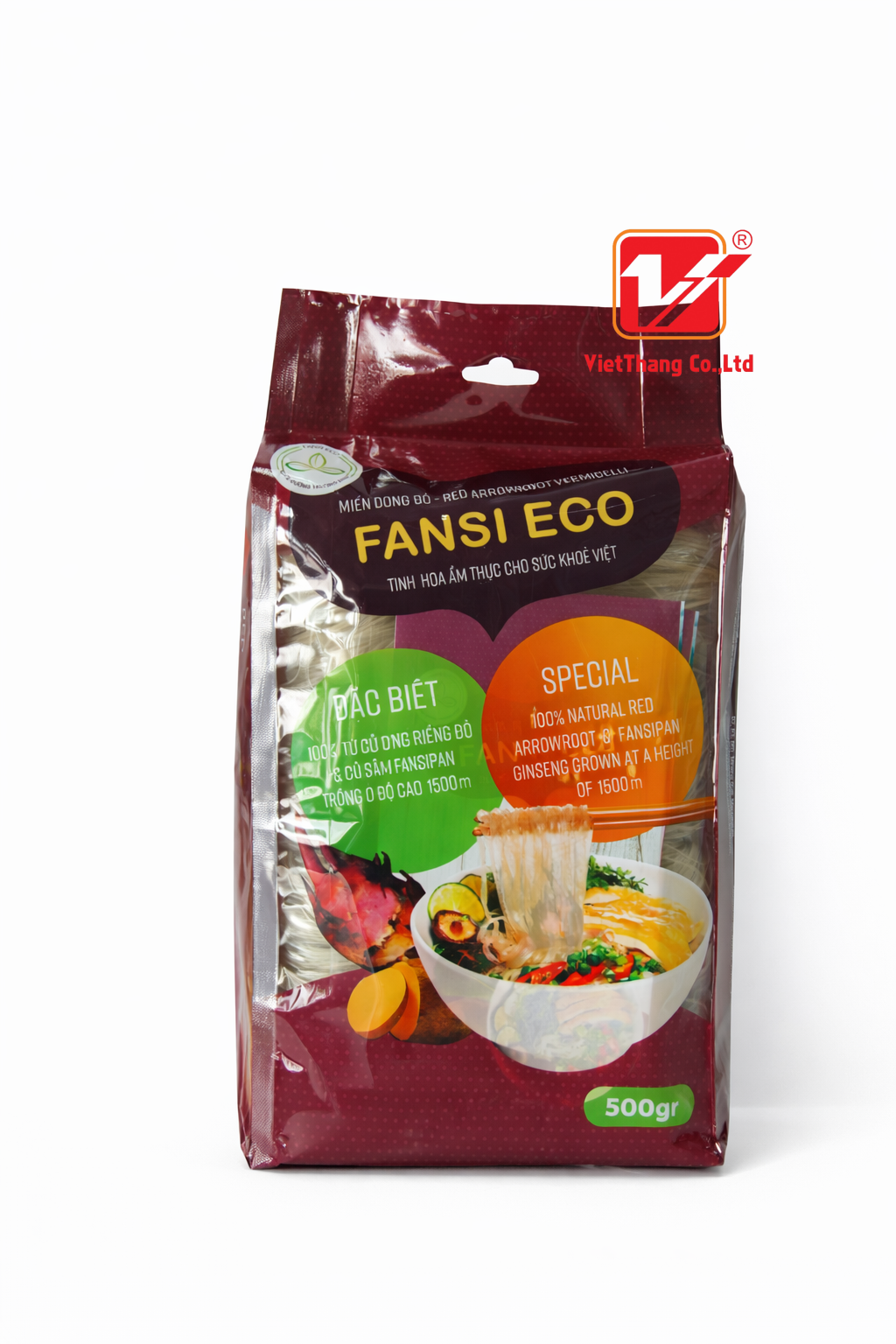 Bao bì miến dong Fansi Eco được thiết kế theo phong cách hiện đại, sạch sẽ và thân thiện, nhấn mạnh rõ tinh thần “Eco” – tự nhiên, an toàn và hướng tới sự bền vững. Ngay từ cái nhìn đầu tiên, túi bao bì tạo ấn tượng bởi màu sắc nhẹ nhàng, hài hòa, kết hợp giữa tông xanh lá thanh mát và sắc trắng tinh khiết. Đây là hai gam màu đại diện cho sự thuần khiết, an toàn sức khỏe và nguồn nguyên liệu sạch từ thiên nhiên – đúng với tinh thần của sản phẩm miến dong truyền thống.