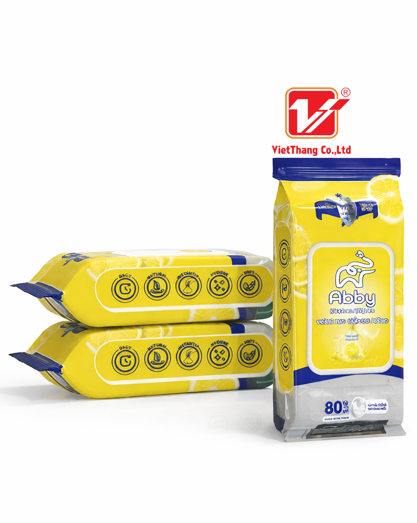 Bao bì túi khăn lau bếp AB được thiết kế theo phong cách hiện đại, sạch sẽ và nổi bật, thể hiện đúng tinh thần của một sản phẩm dành cho không gian bếp – nơi luôn cần sự gọn gàng, tinh tươm và khử sạch mọi vết bẩn khó nhằn. Ngay từ cái nhìn đầu tiên, thiết kế bao bì đã tạo được ấn tượng mạnh mẽ nhờ tông màu vàng – trắng – xanh navy đầy tươi sáng. Màu vàng là biểu tượng của sự sạch sẽ, mùi hương chanh dịu nhẹ; màu trắng đại diện cho tinh khiết; và màu xanh navy đem đến cảm giác tin cậy, chắc chắn. Tổng thể phối hợp hài hòa giúp bao bì trở nên dễ nhận diện, bắt mắt và truyền tải đúng thông điệp của sản phẩm.